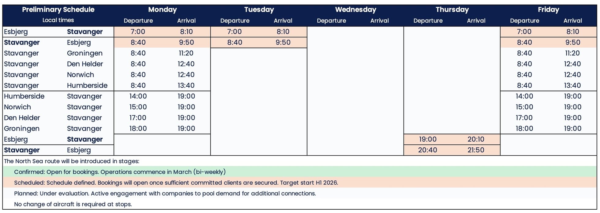 The preliminary schedule has been developed with local companies to ensure that flights align with industry crew rotation patterns and business travel demands.